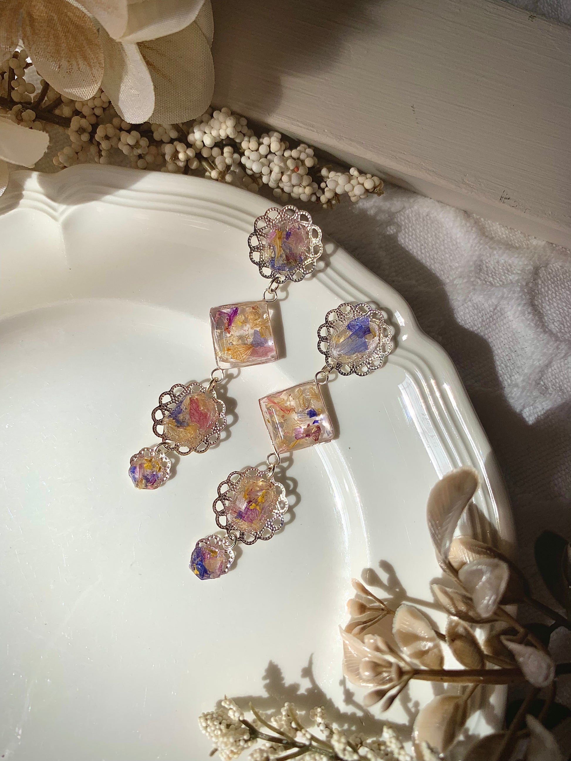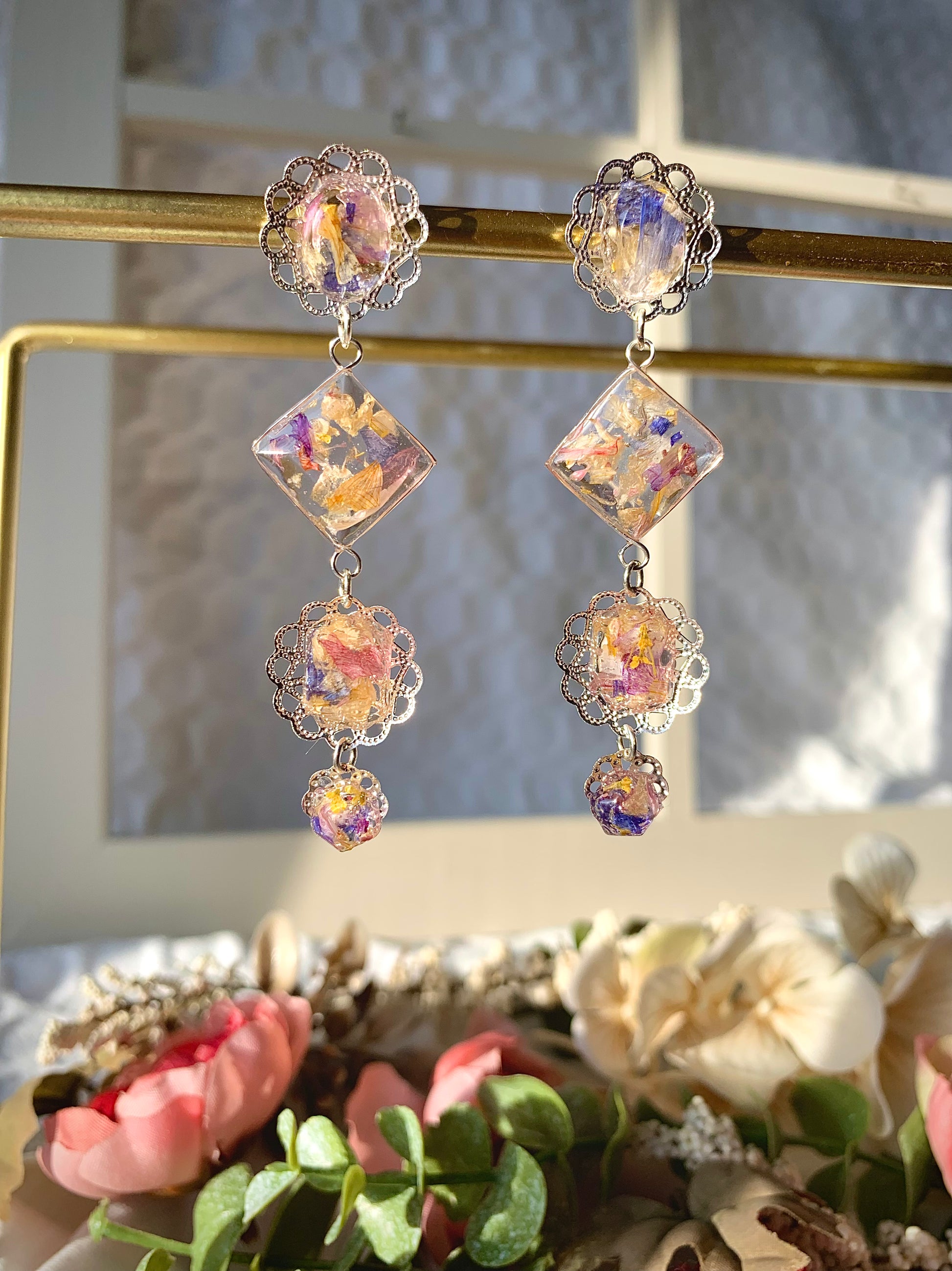 A cascade of vibrant blossoms twists and shimmers like a spellbound prism, each petal reflecting a new hue with every movement. Delicate chains carry tiny jewels and blooms, turning every sway into a dance of enchanting color and light.