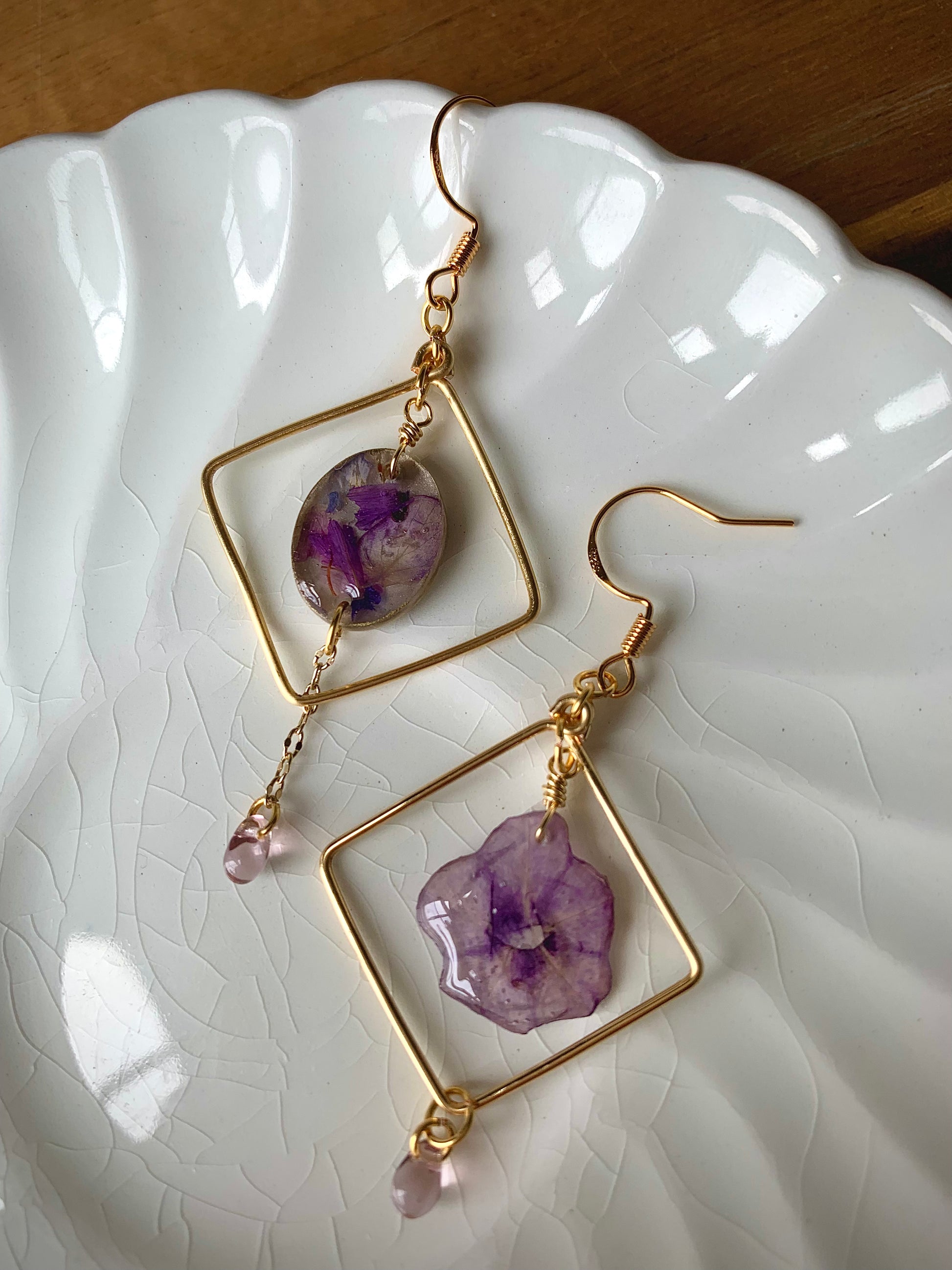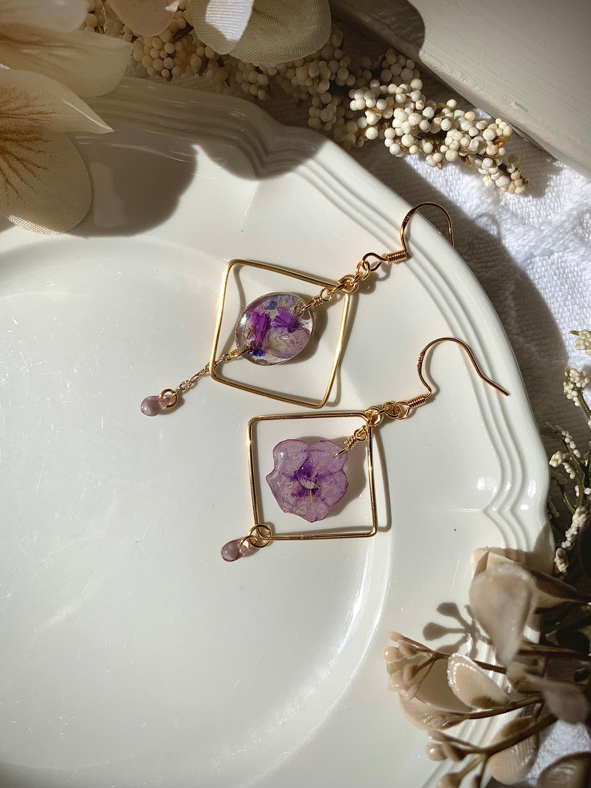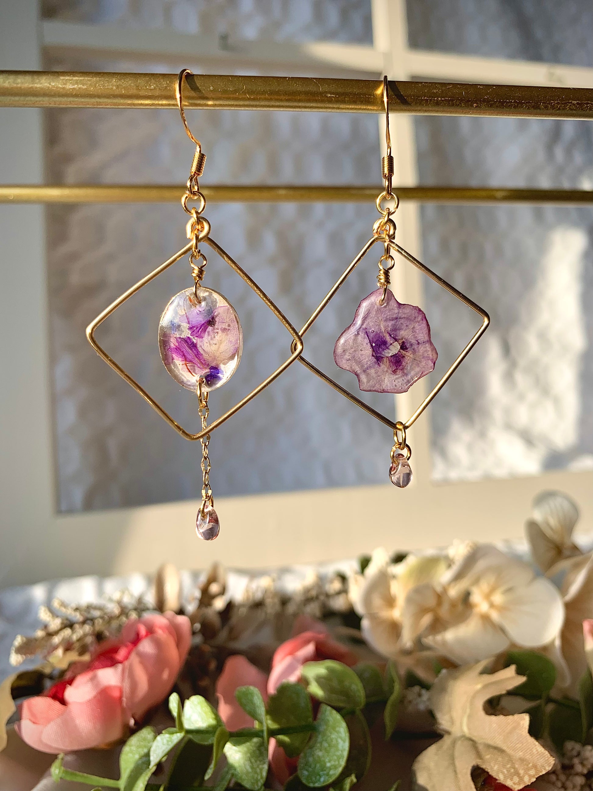A delicate bloom floats within a golden diamond, catching the light like a secret garden at dawn. From its chain hangs a tiny jewel, sparkling like a dewdrop kissed by morning sun, swaying gently with every movement.