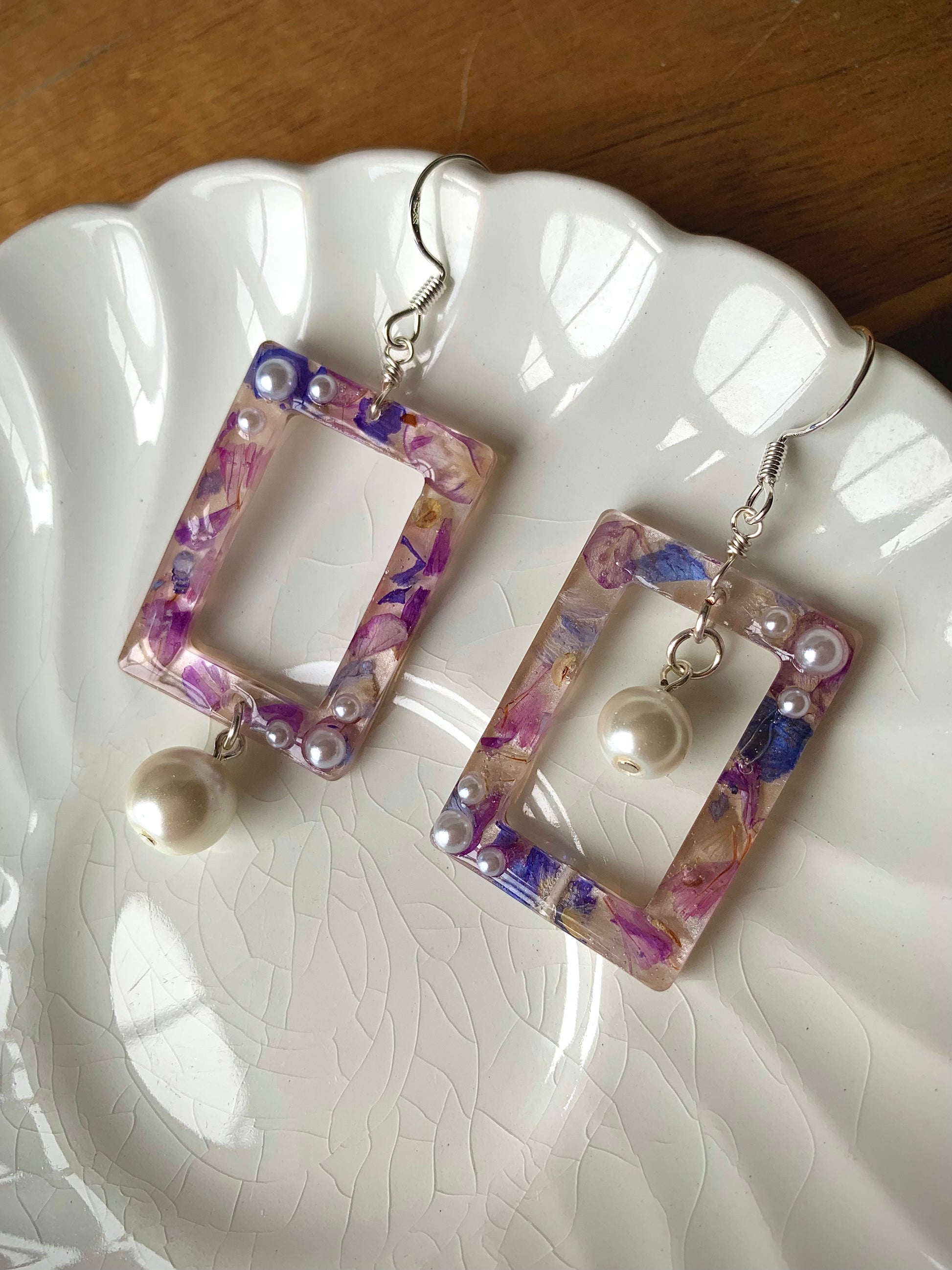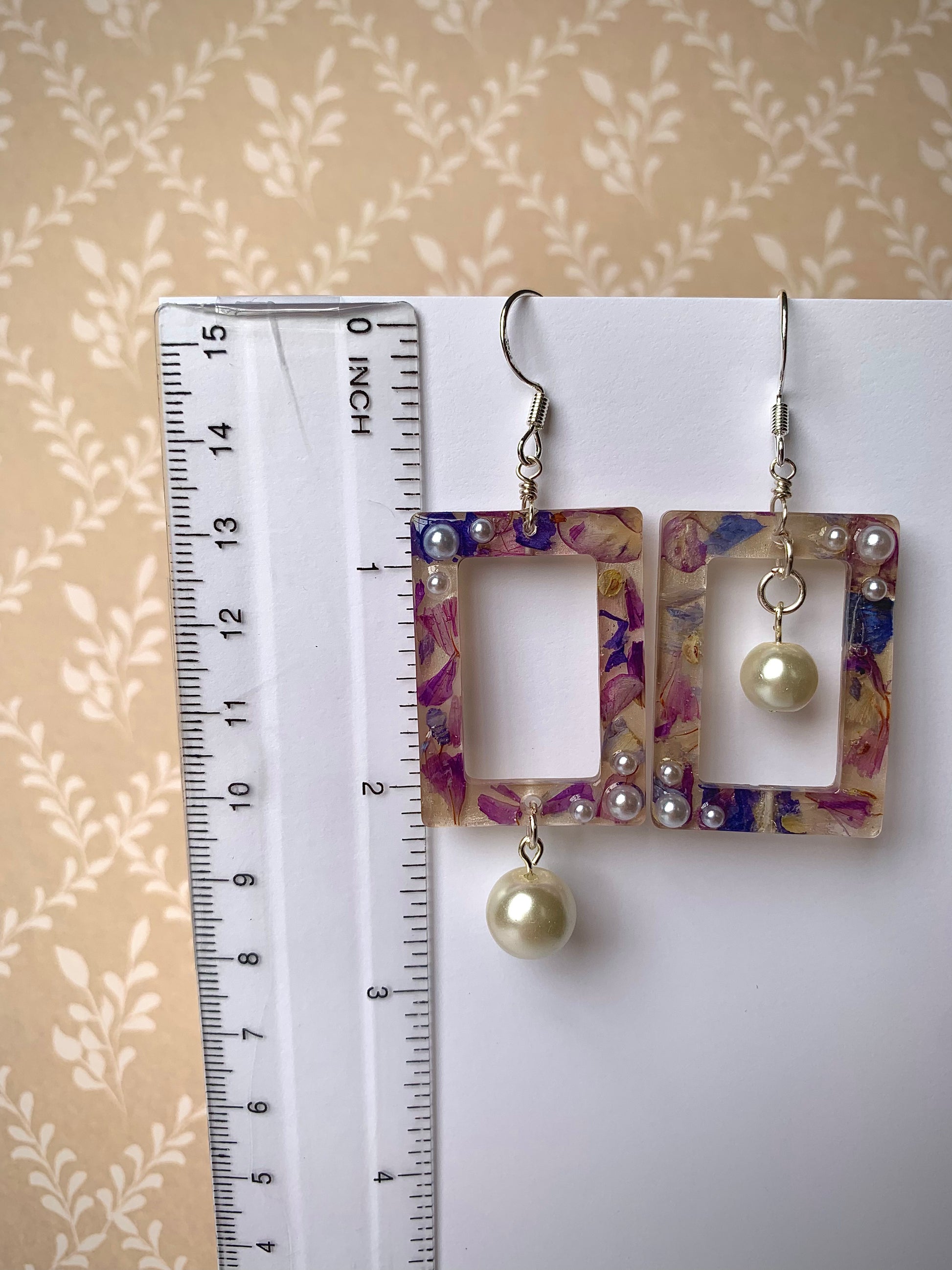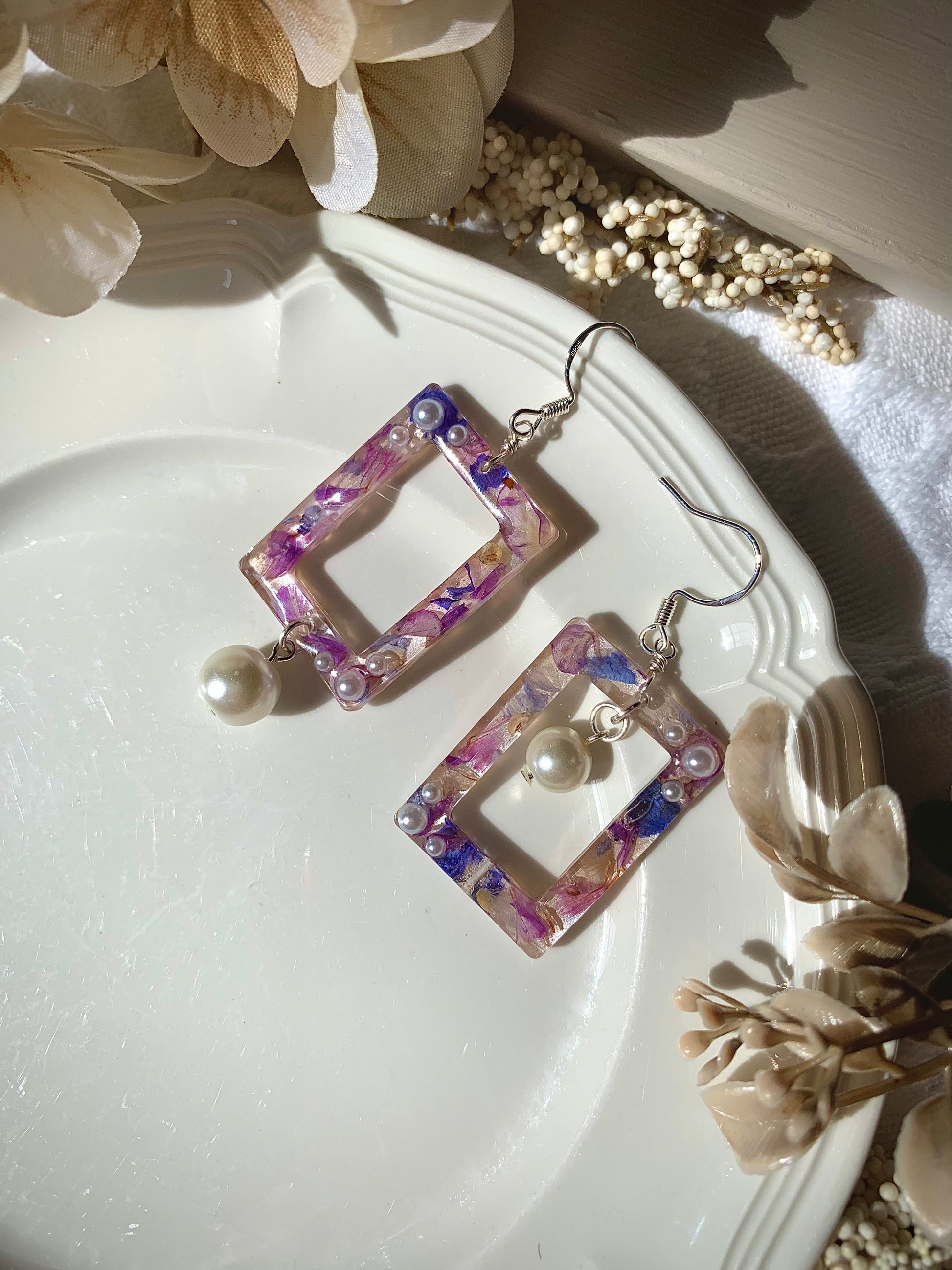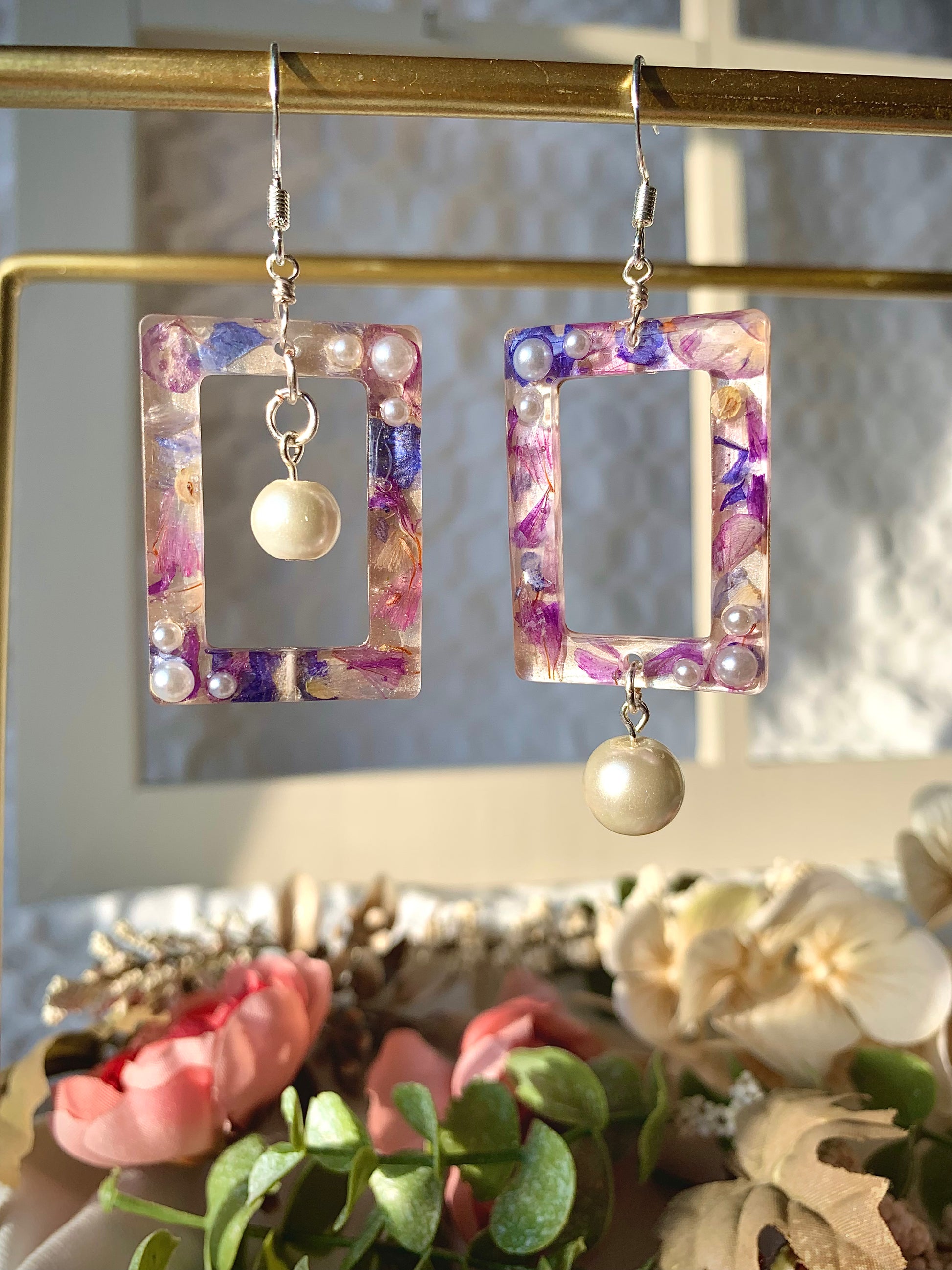 A rainbow of blossoms shimmers within a crystal-clear rectangle, as if a tiny enchanted garden has been captured in a magical prism. Beneath, a lustrous pearl swings gently, like a secret treasure kissed by morning light.