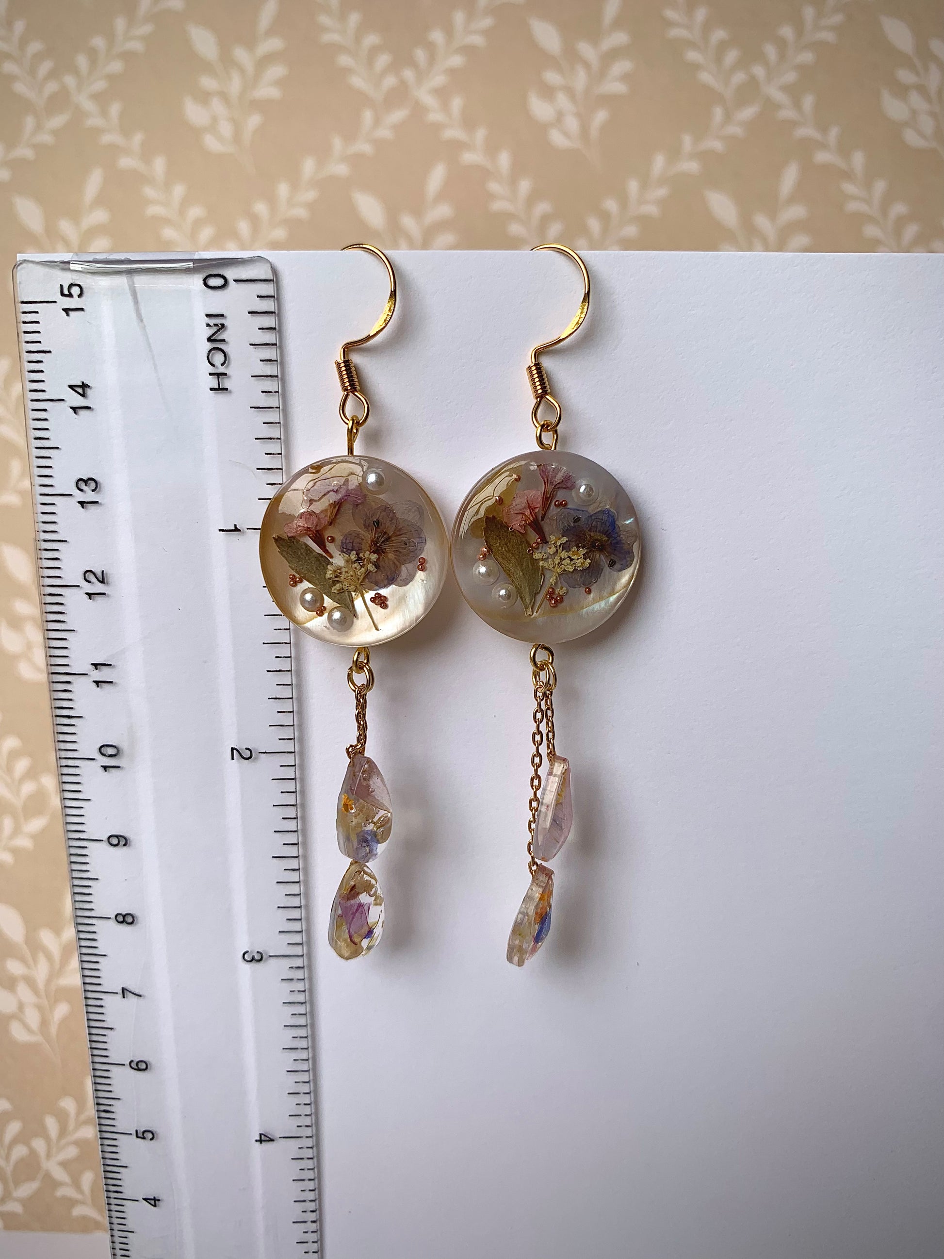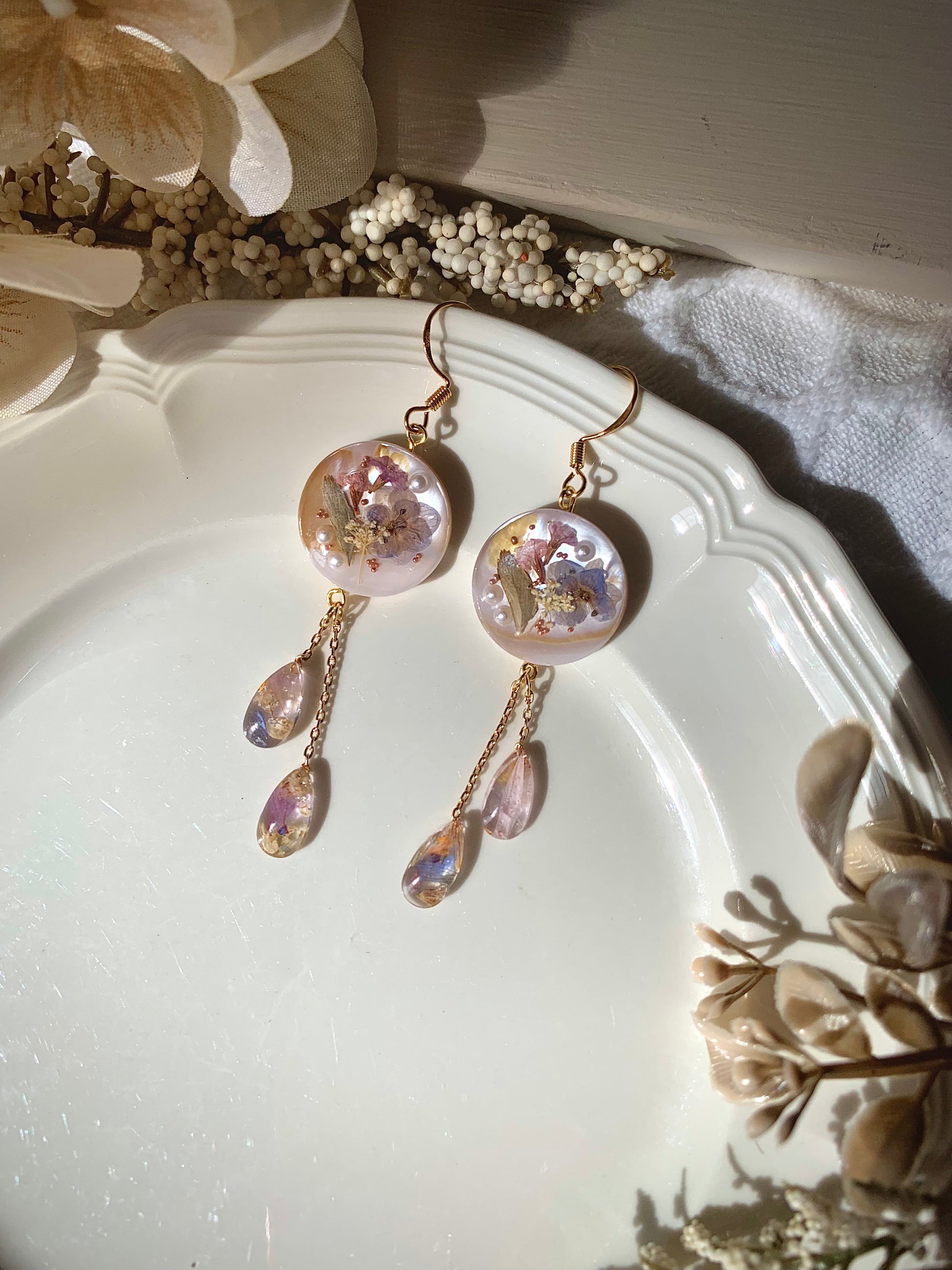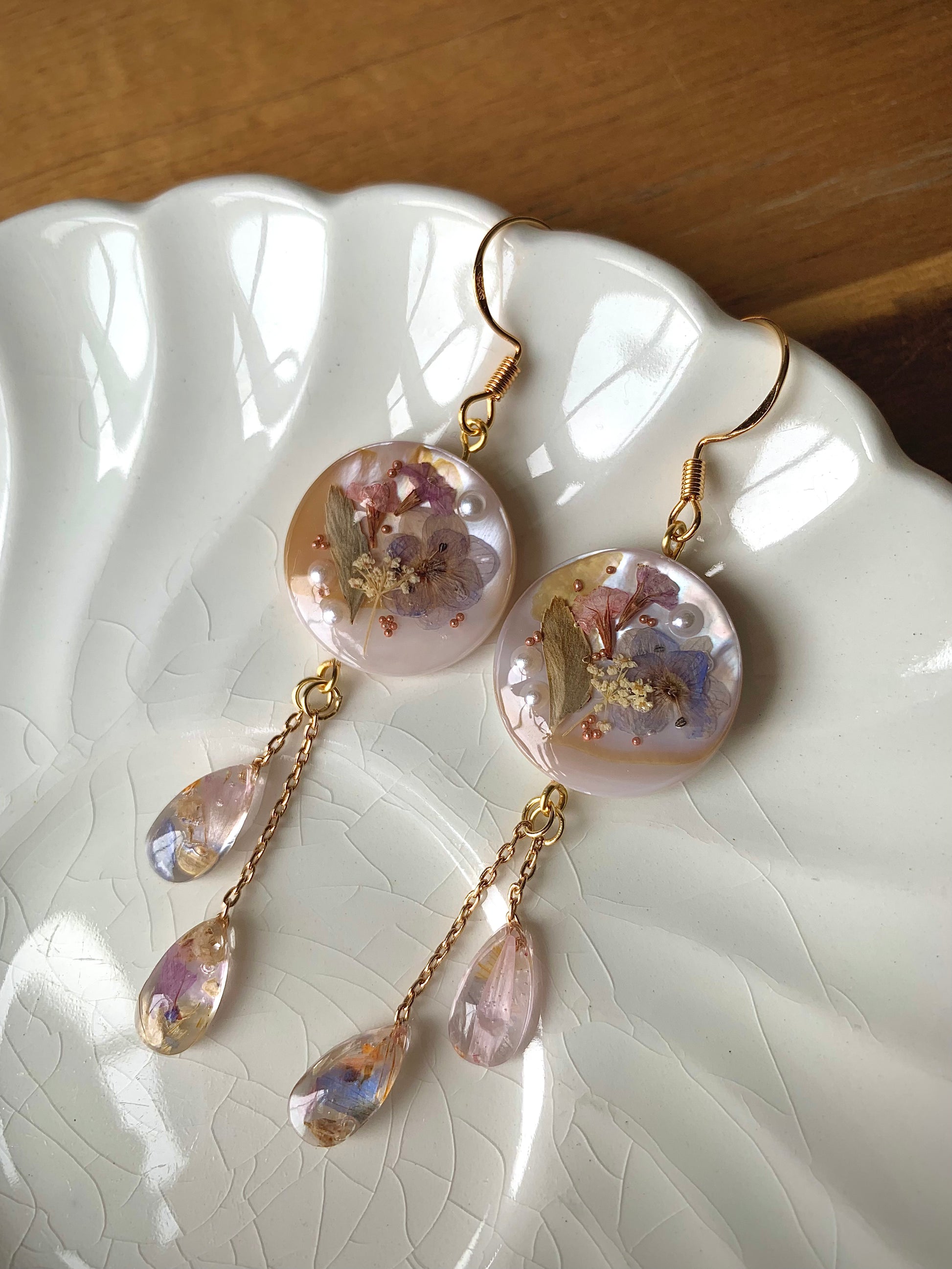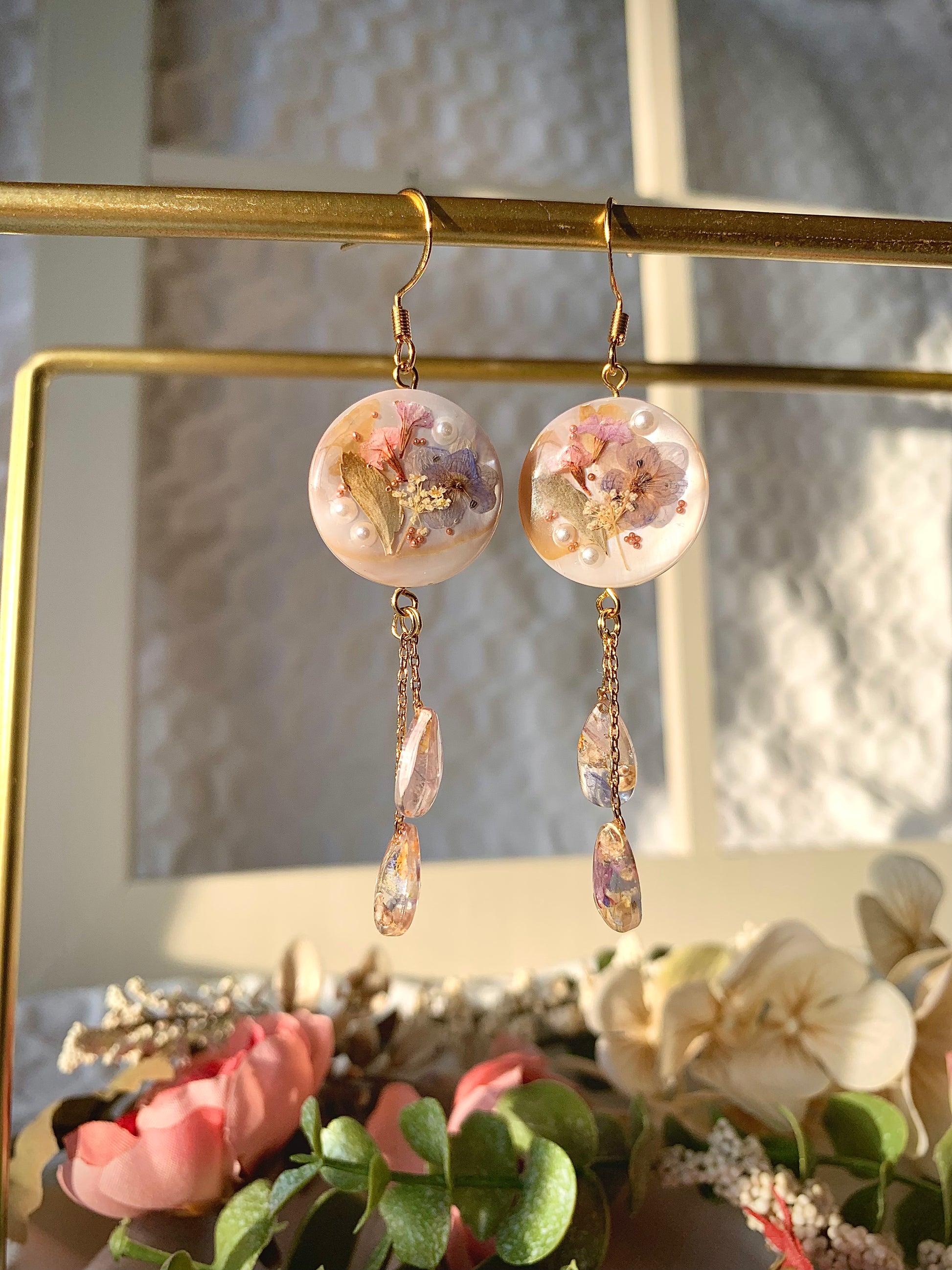 Tiny blossoms and glowing pearls rest side by side in crystal resin, a tender harmony of nature’s finest treasures. Golden chains let the gardens sway with grace, as though each step releases a whisper of magic from a storybook meadow.