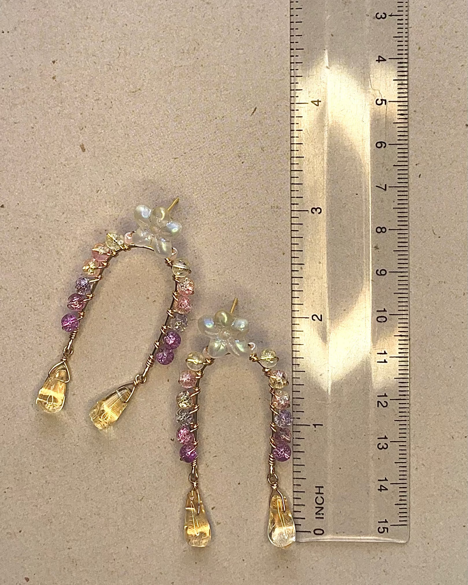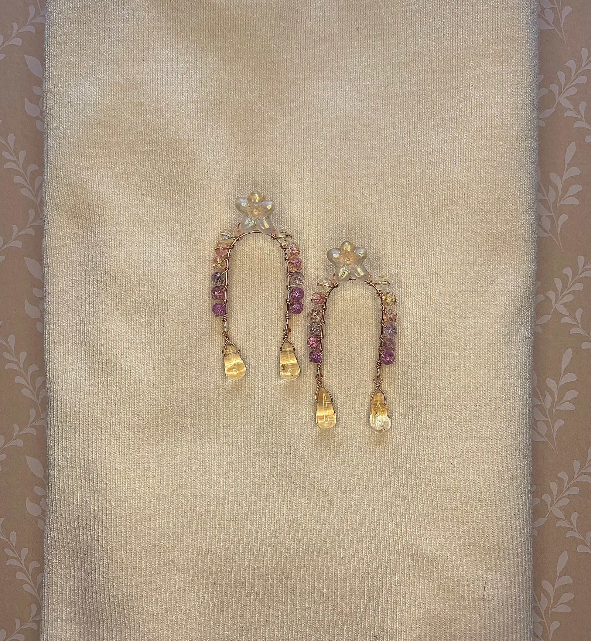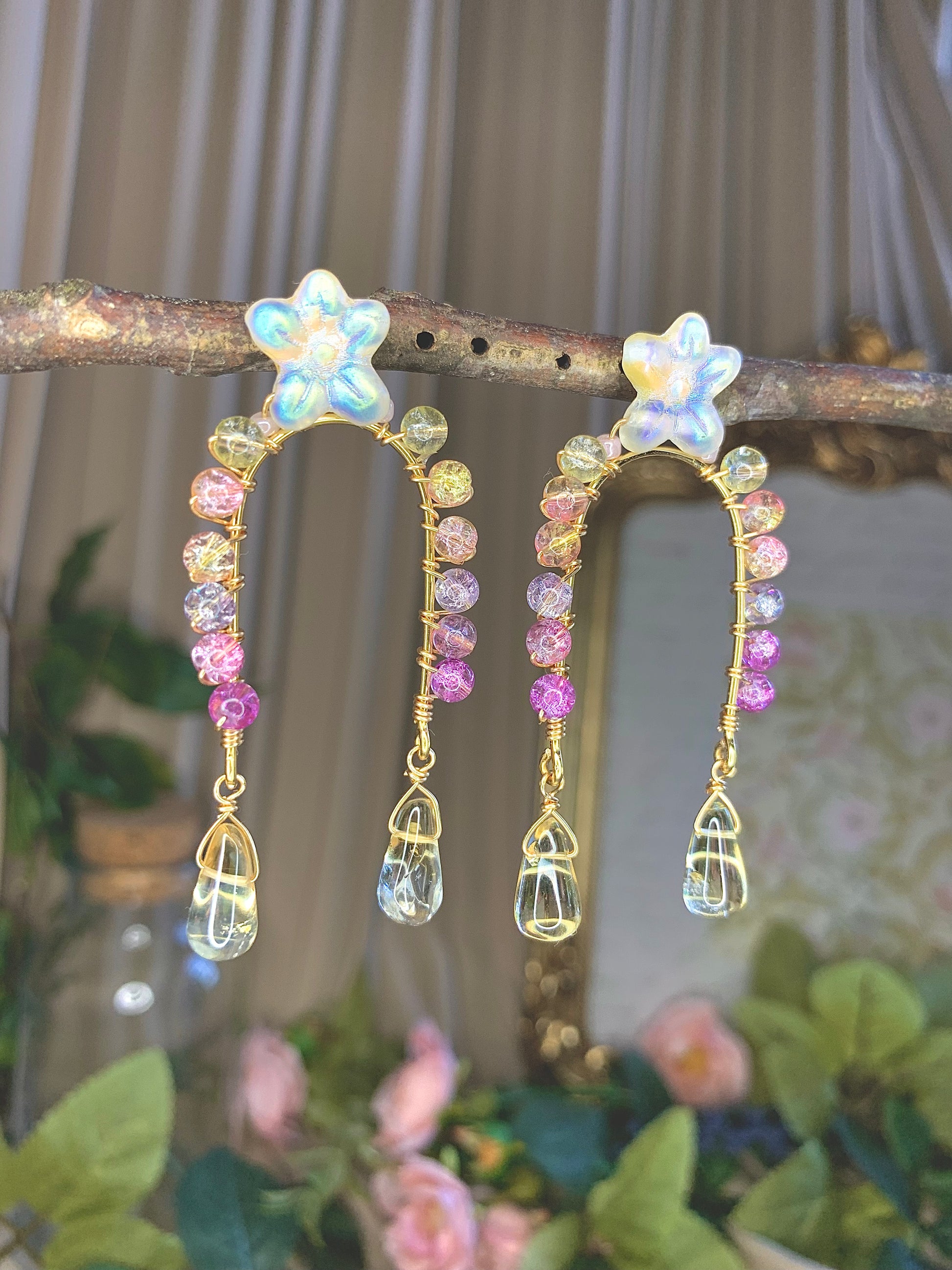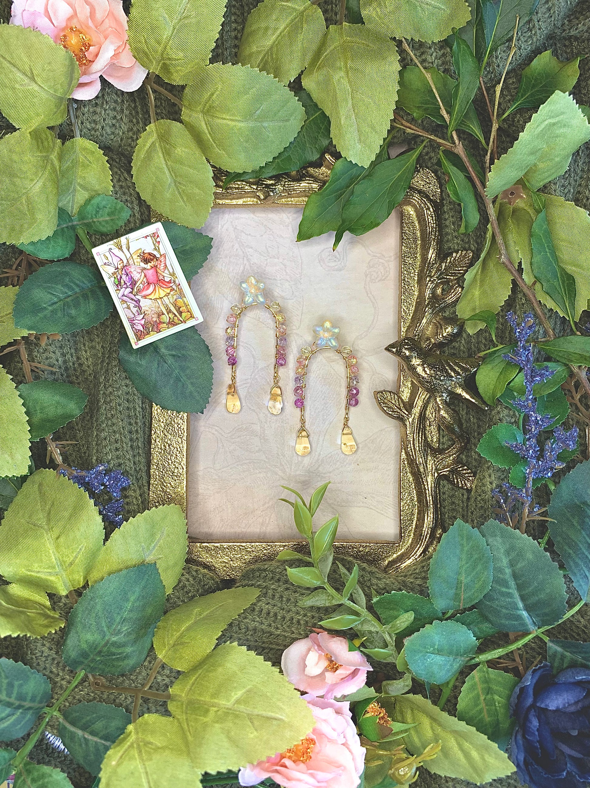 Upon a crown of columbine blossoms, a tiny fairy plays her flute as the Columbine Fairy dances in jeweled delight. These earrings capture their whimsical duet, with sparkling details that feel as though they’ve been spun from music and starlight.