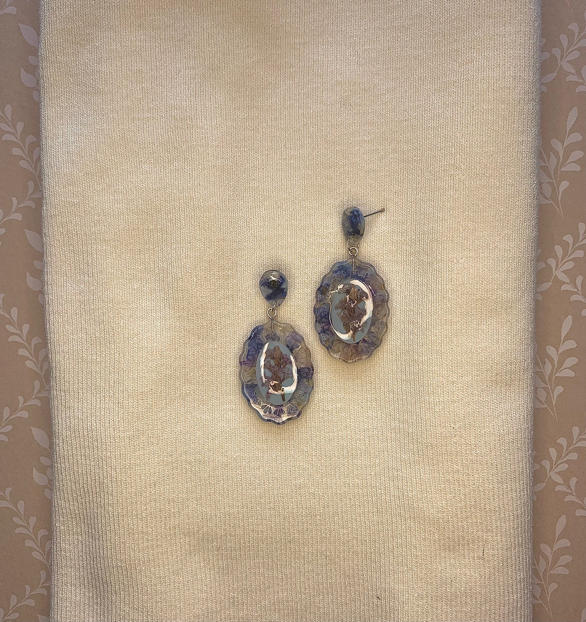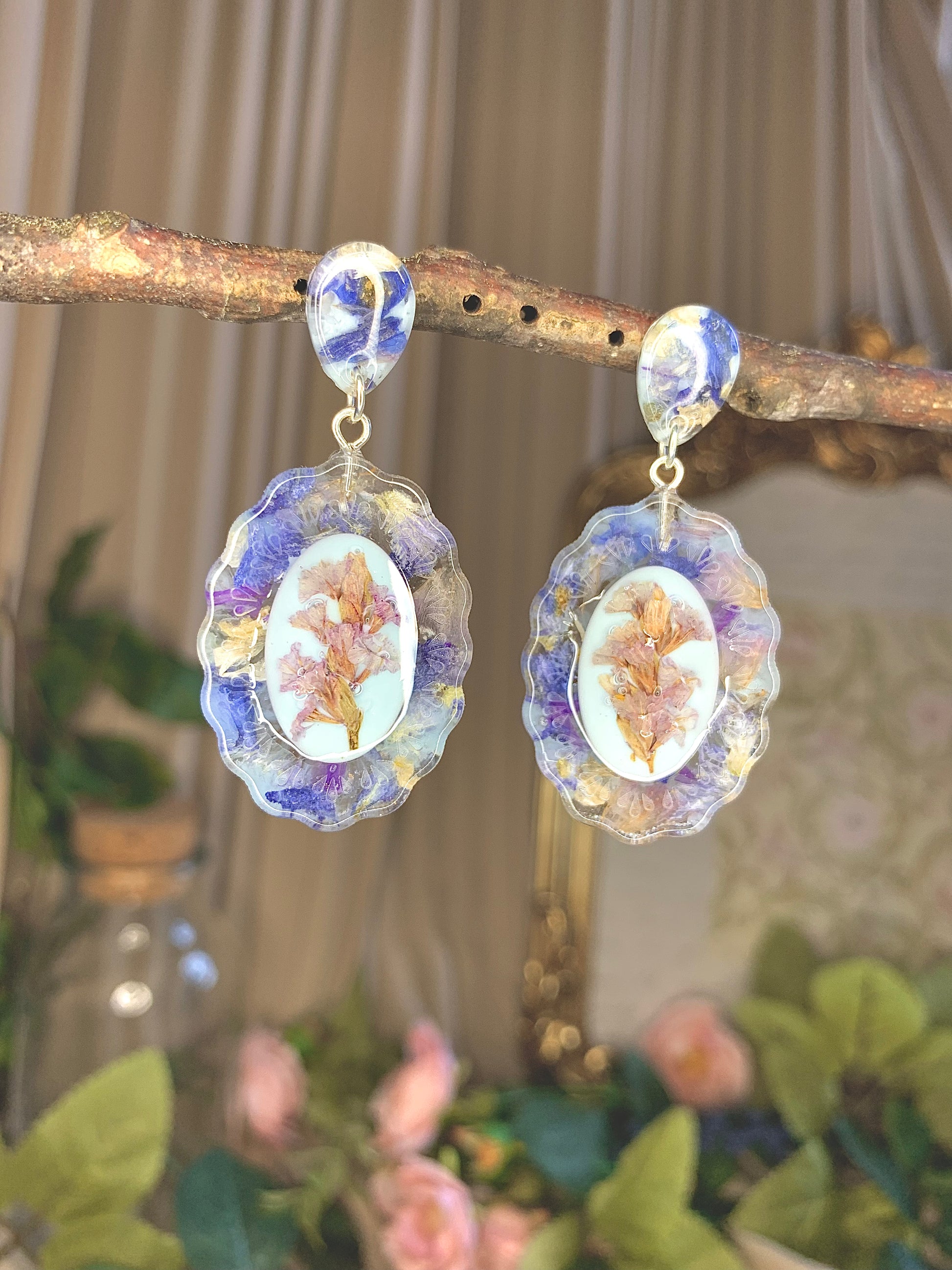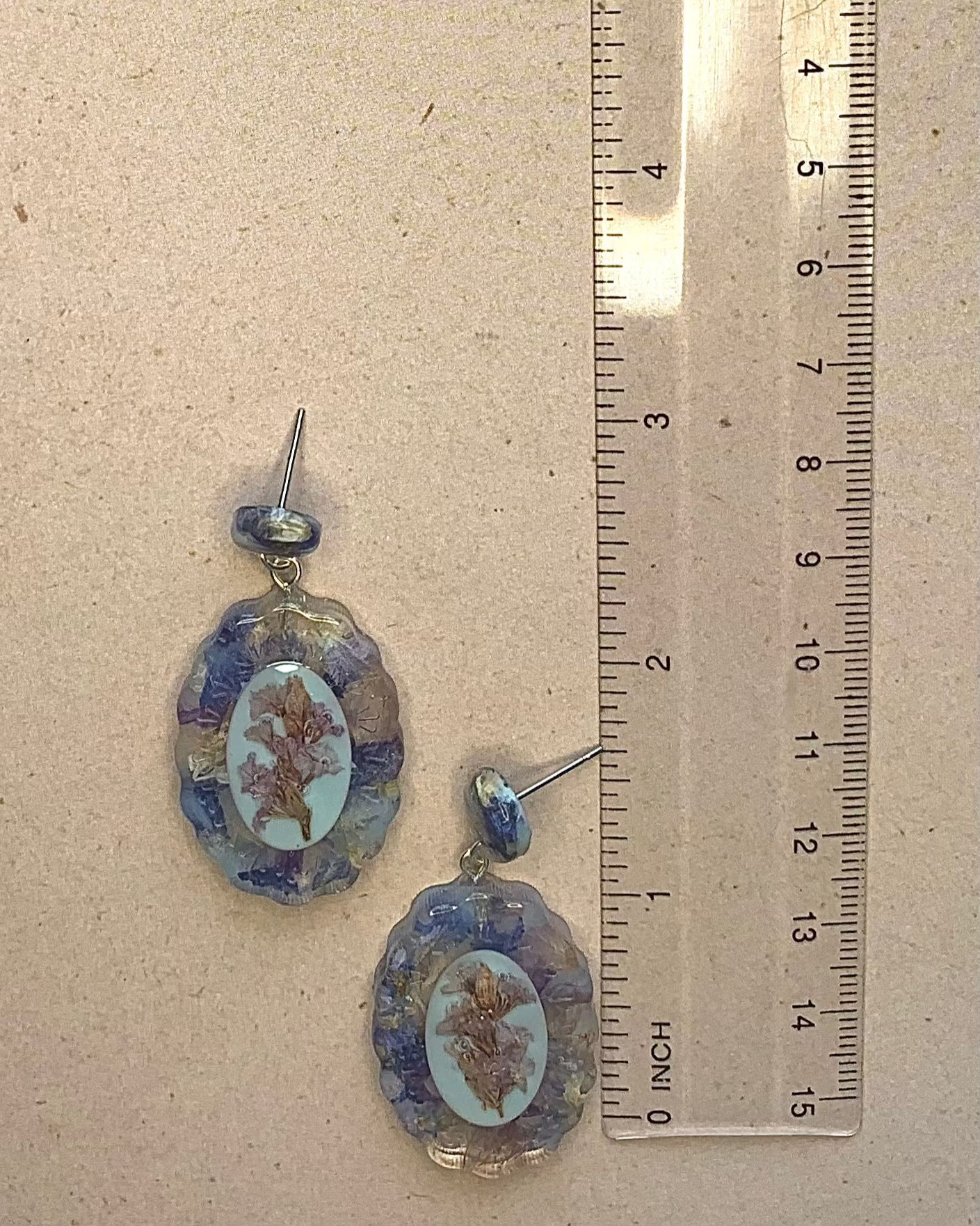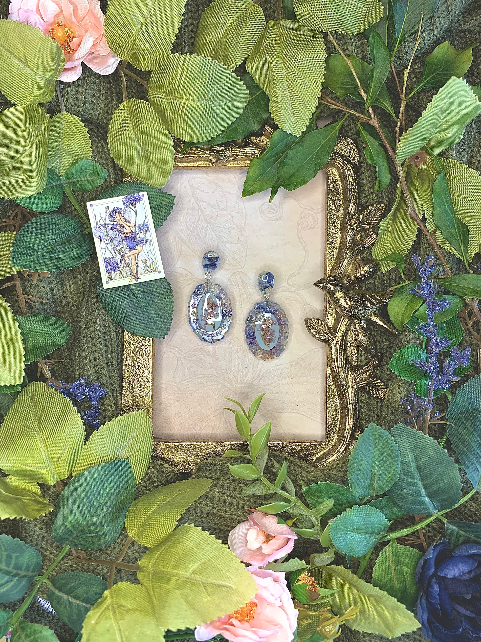 Amid bright blue cornflowers, a bashful fairy sways like a petal in the summer breeze, her gown mirroring the flower’s vivid hue and feathery crown. These earrings hold her playful magic, with delicate blossoms and shimmering touches reminiscent of fields kissed by silver light.