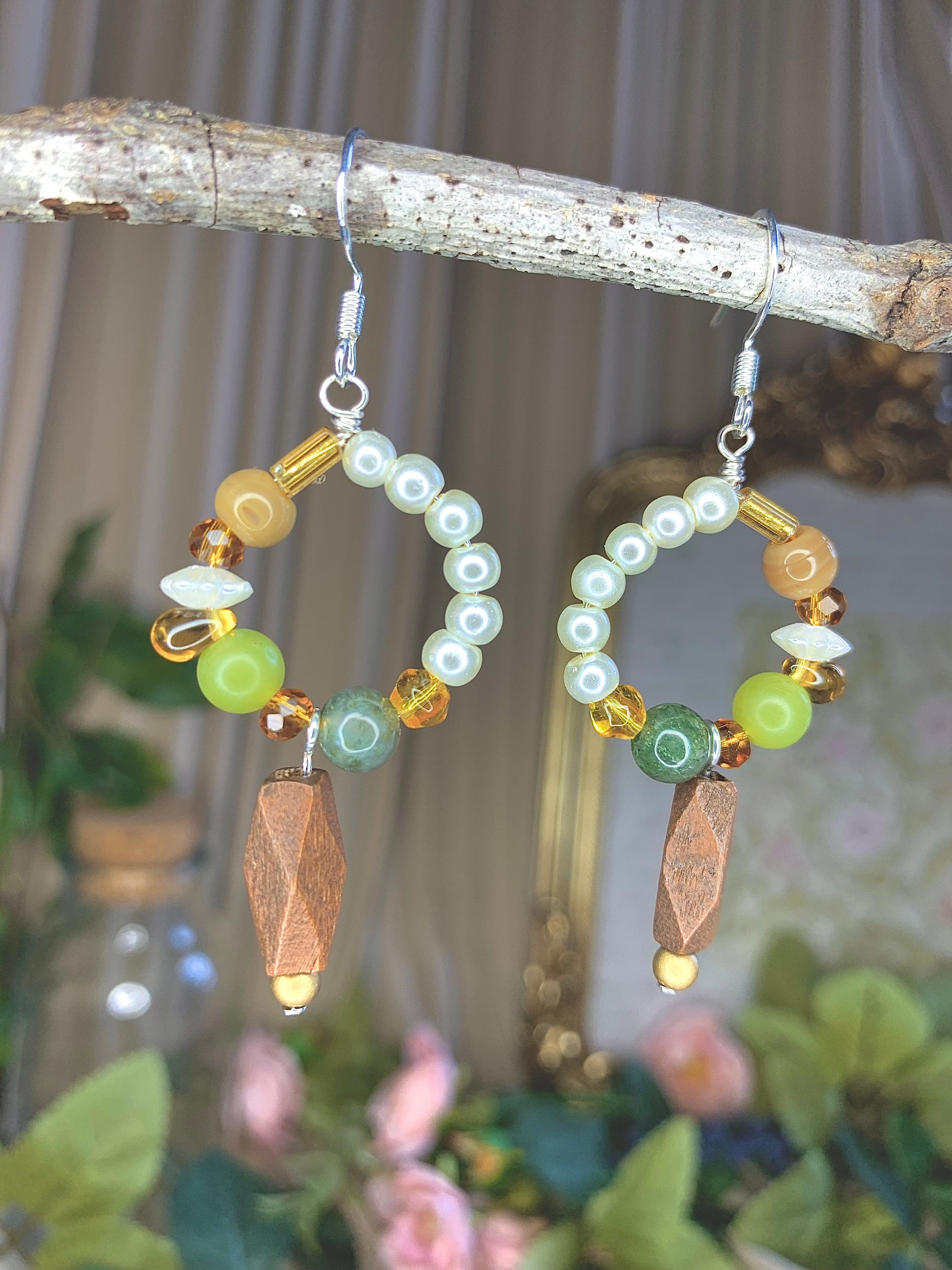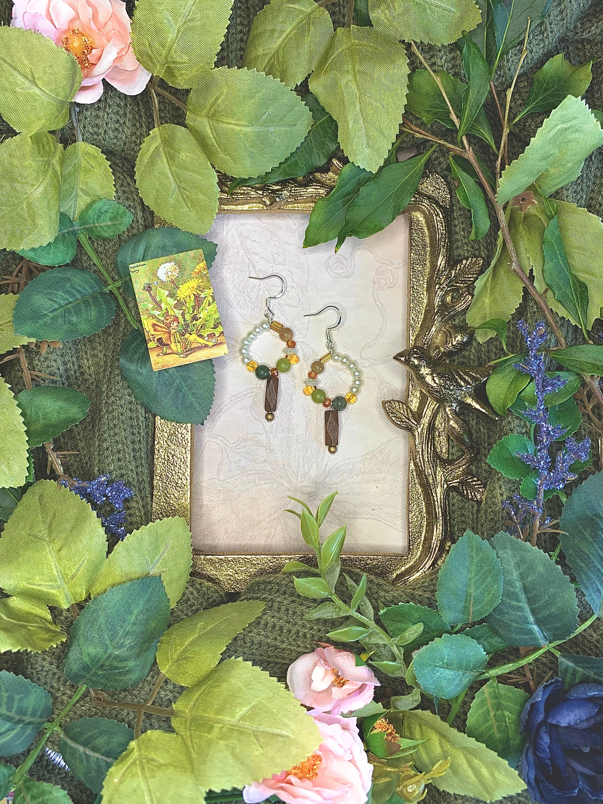 Beneath a hue of golden dandelion blooms, the fairy sits in serene delight, her wings glimmering softly. Each earring glimmers with the quiet enchantment of a meadow touched by fairy magic.