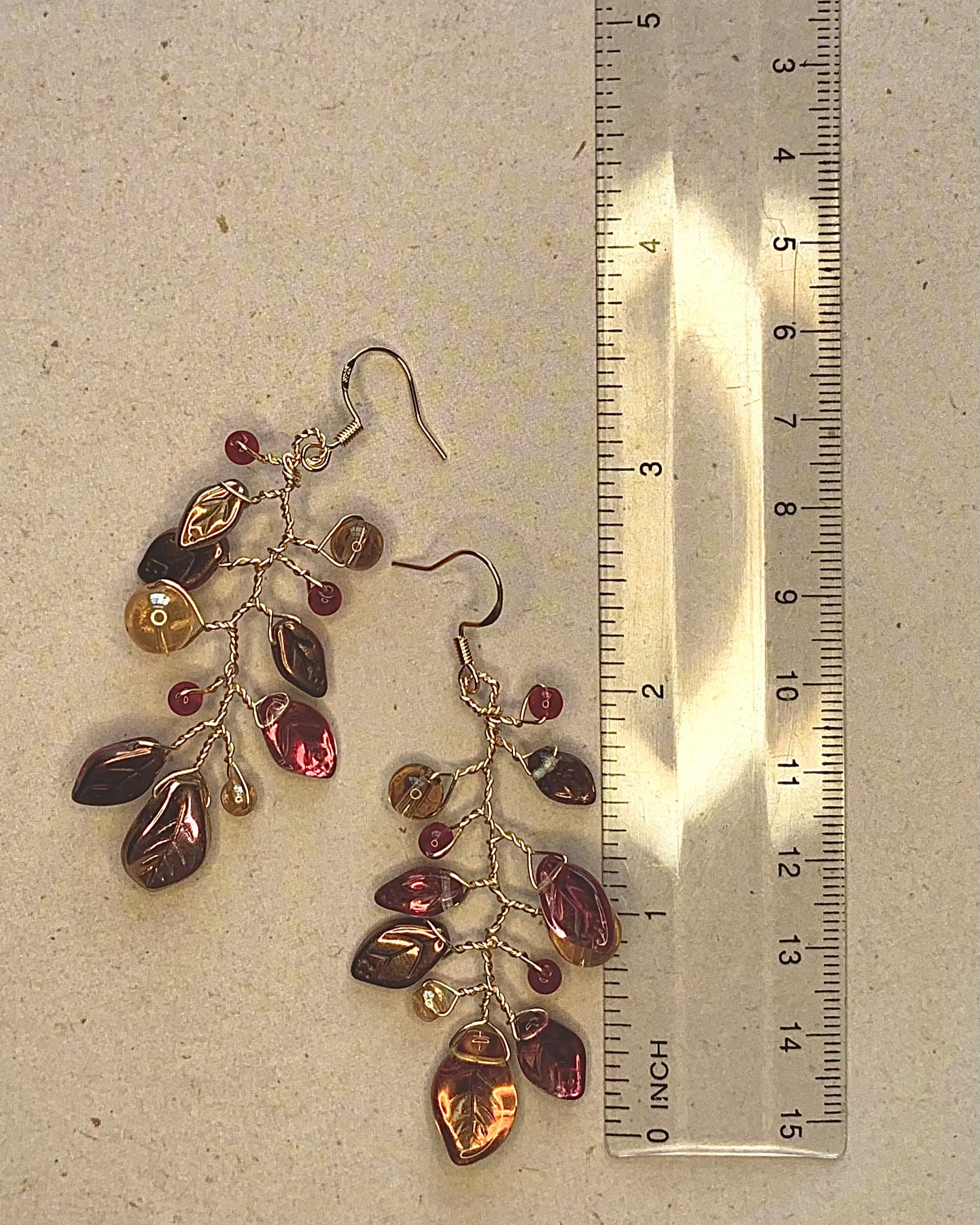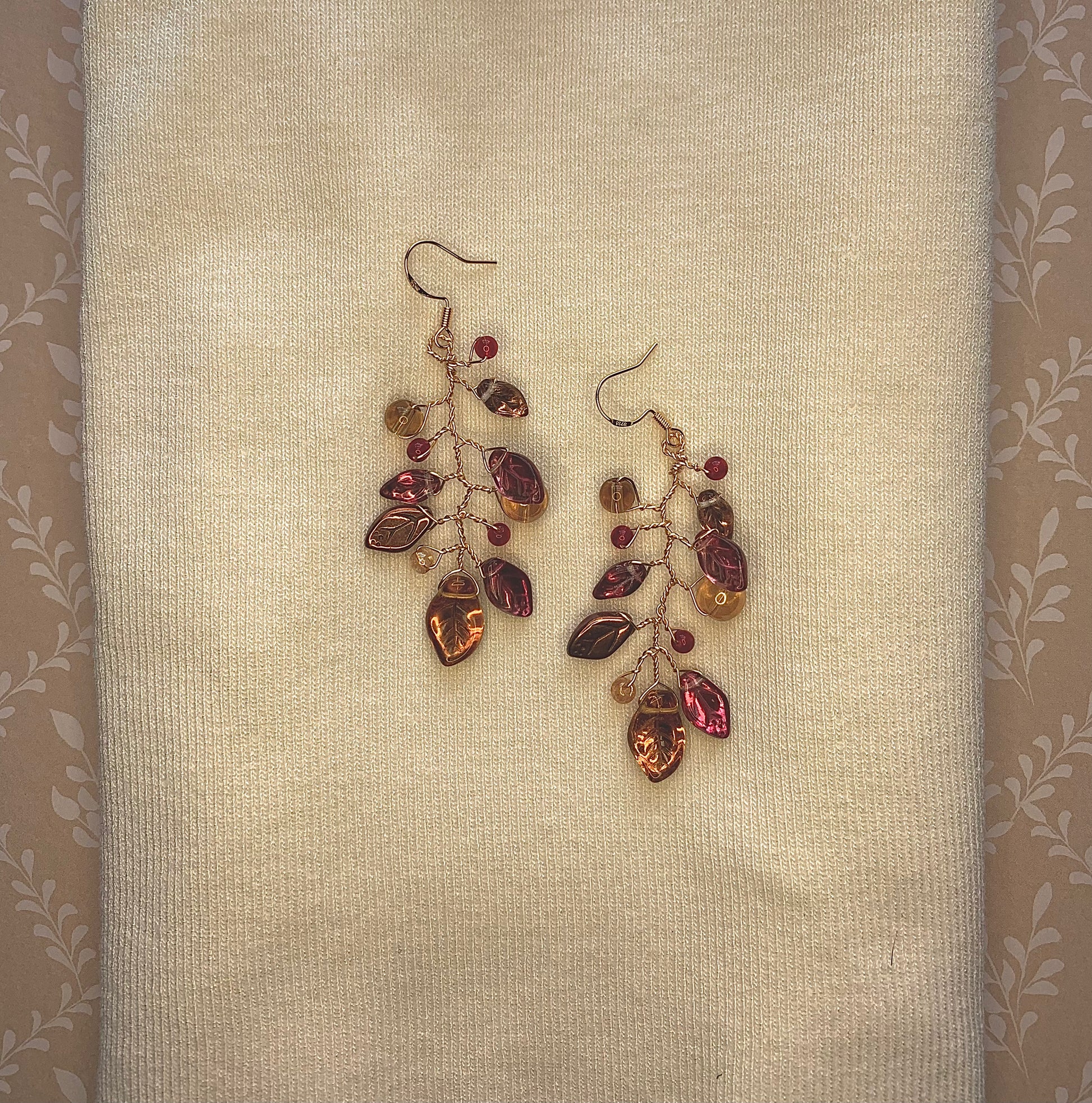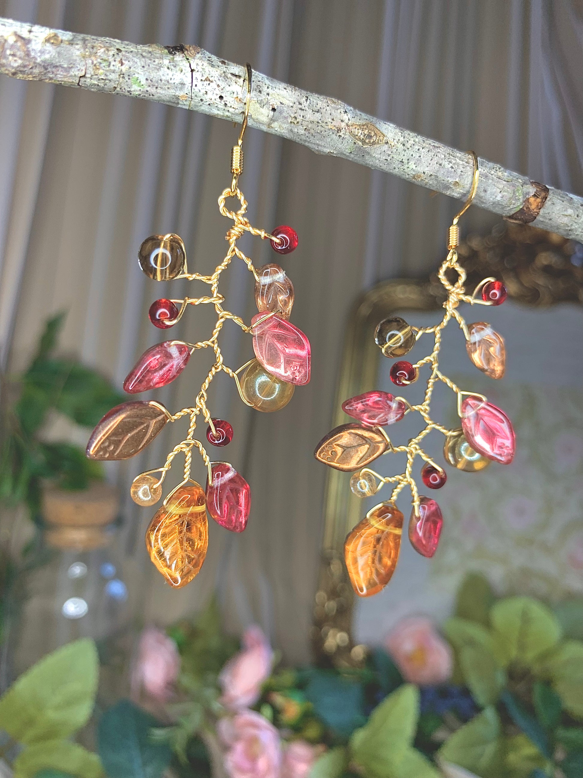 A cheerful little fairy sits among clusters of bright hawthorn berries, his sweet smile capturing the gentle magic of the woodland. These earrings, created with intricate craftsmanship, cascade like delicate hawthorn leaves along slender stems, echoing the rich, verdant beauty of the tree and the quiet charm of a sun-dappled grove.