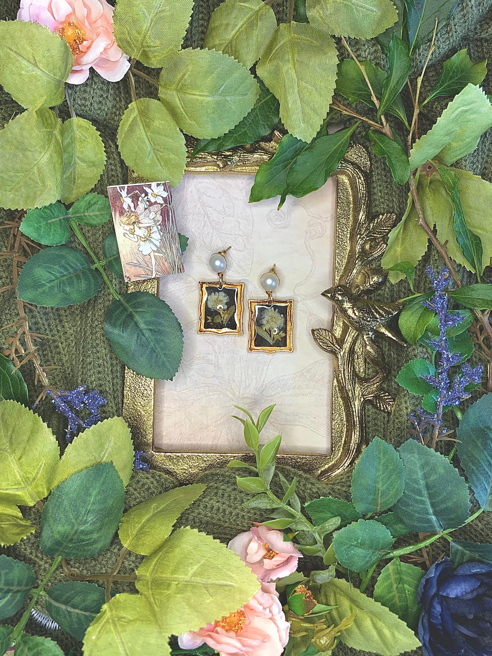 Through a sea of ivory trumpets crowned with golden hearts, the little Narcissus Fairy runs laughing, her footsteps light as petals on the breeze. These elegant earrings, shaped in the likeness of the blooms, hold the grace of springtime mornings and the joy of flowers swaying beneath a gentle sun.