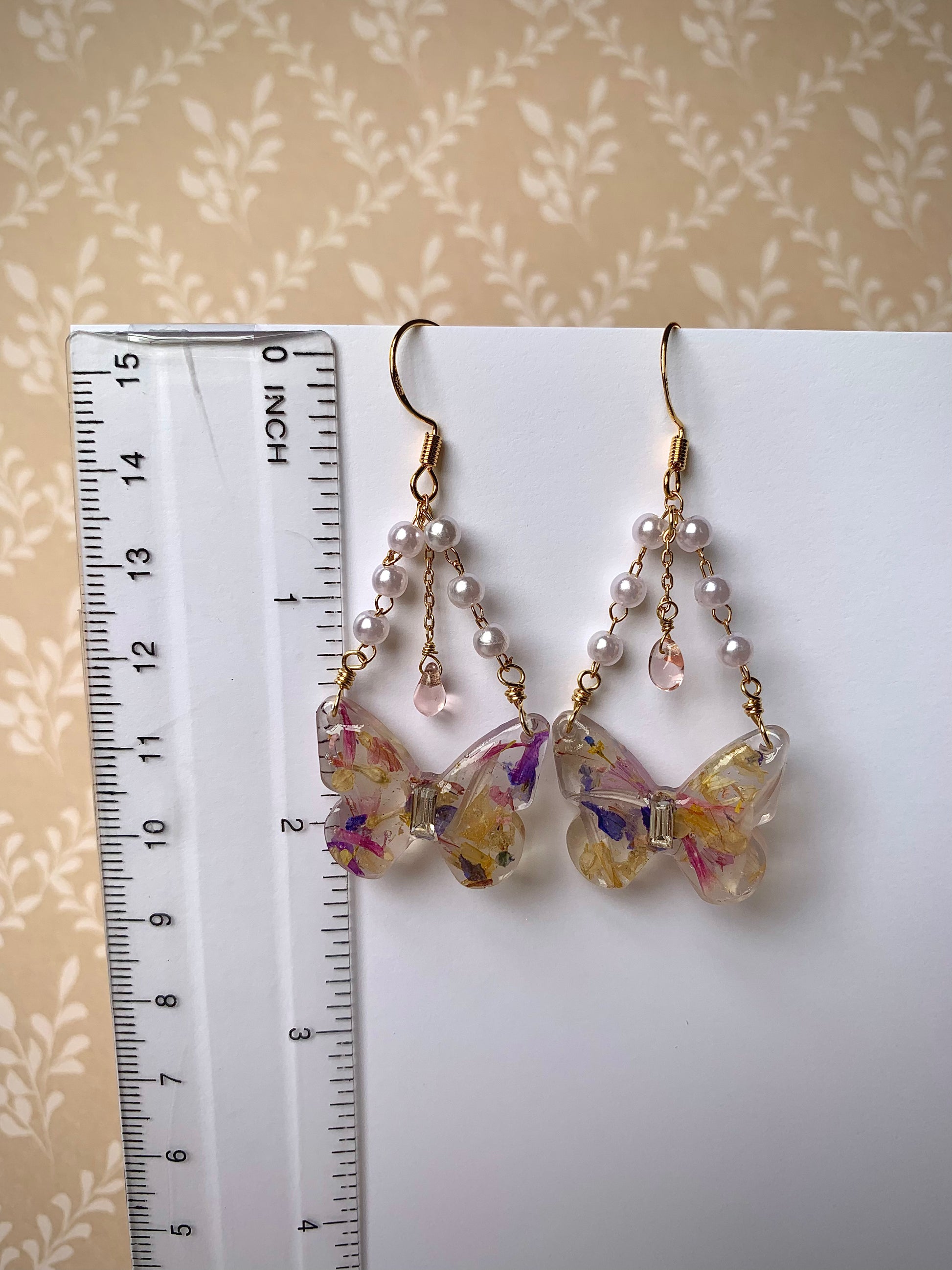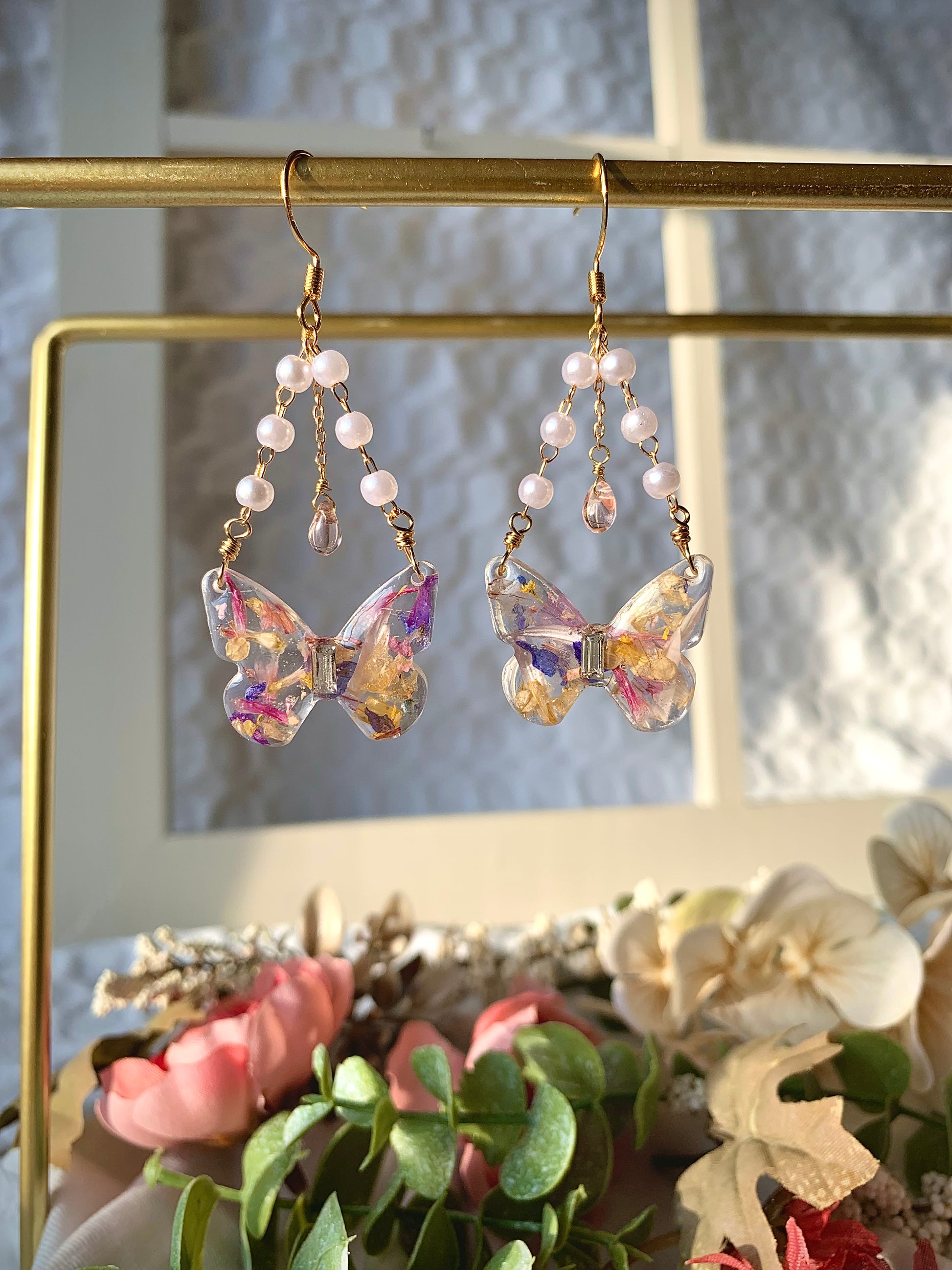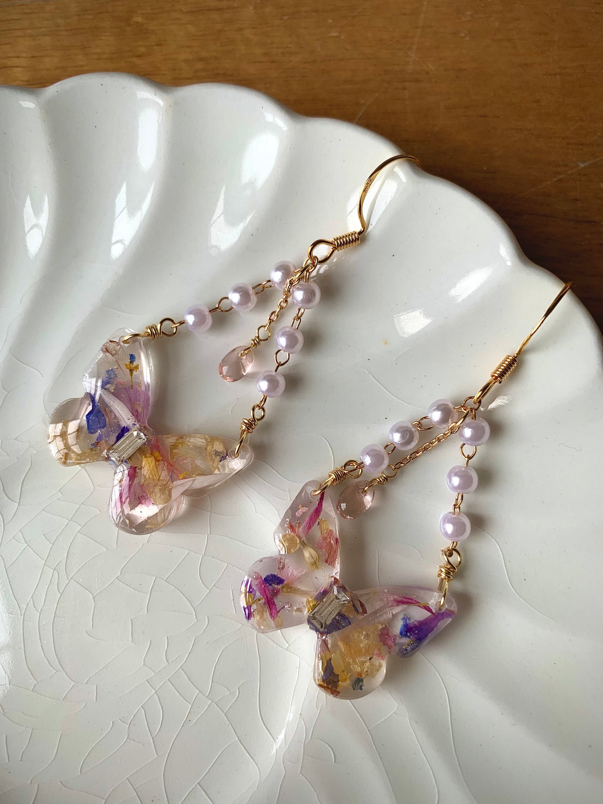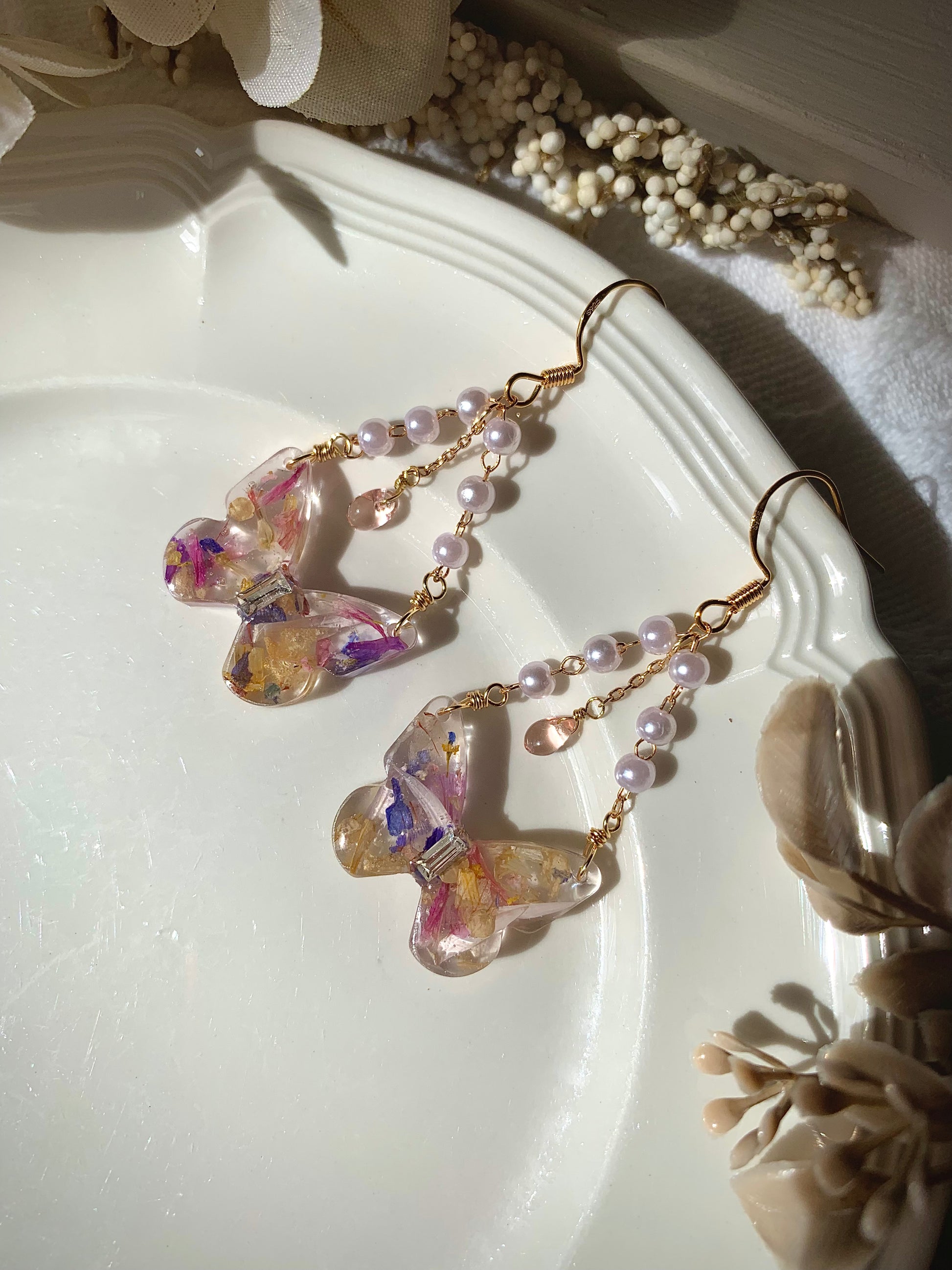 A butterfly of blossoms takes flight, its wings shaped from resin petals in a dance of color. Two strands of luminous pearls let it drift with elegance, as though a garden spirit paused to rest upon threads of sunlight.