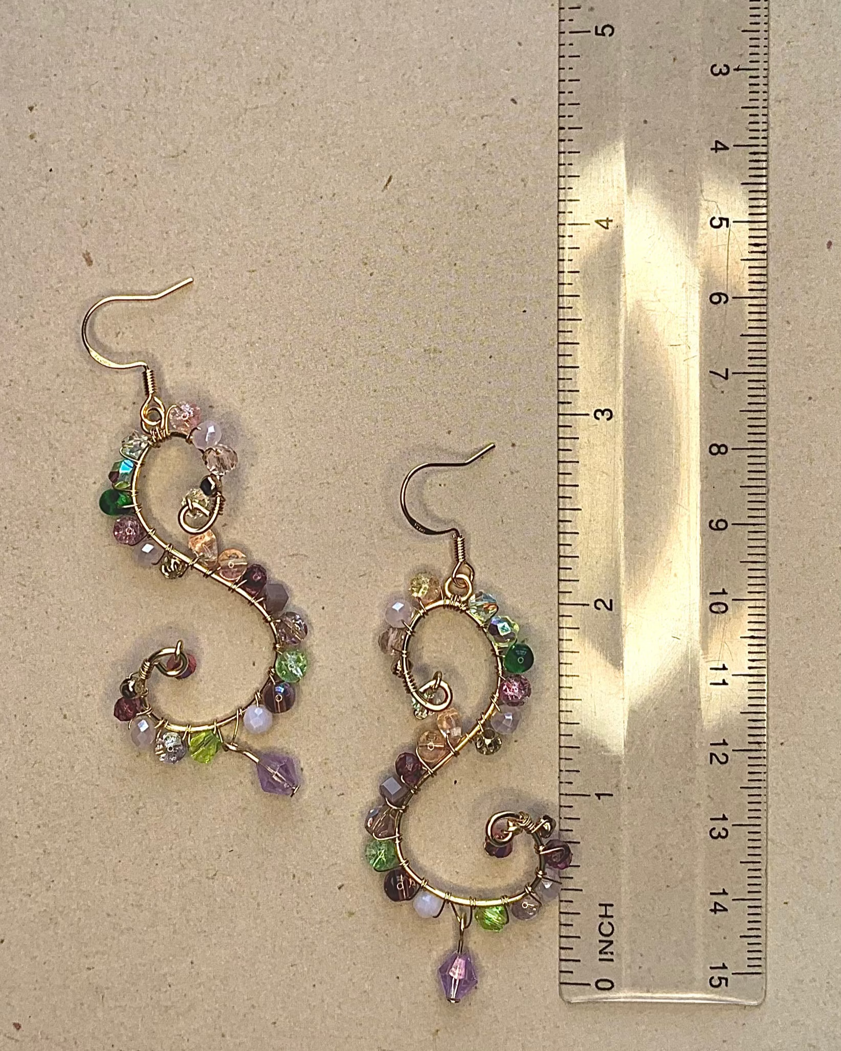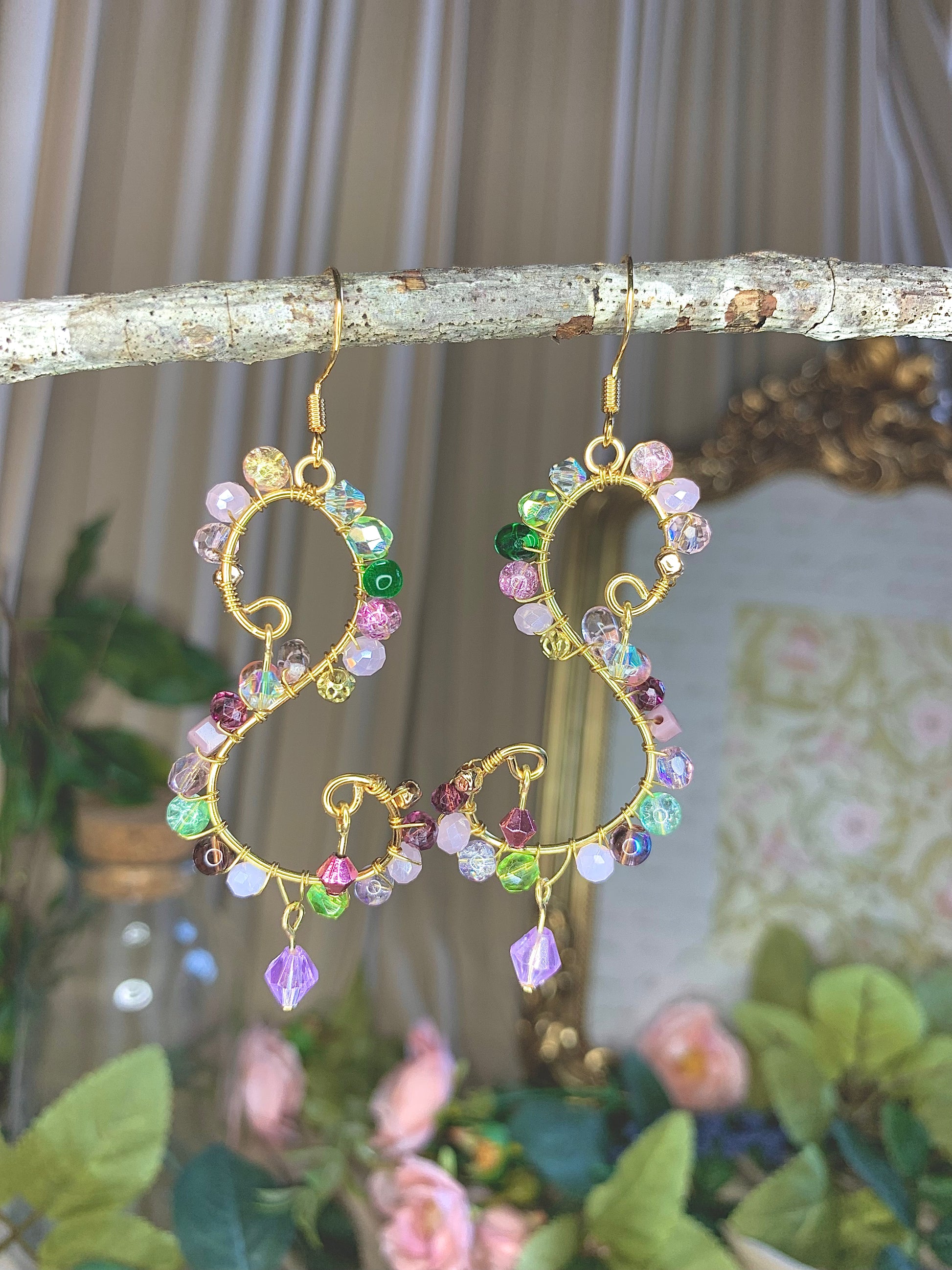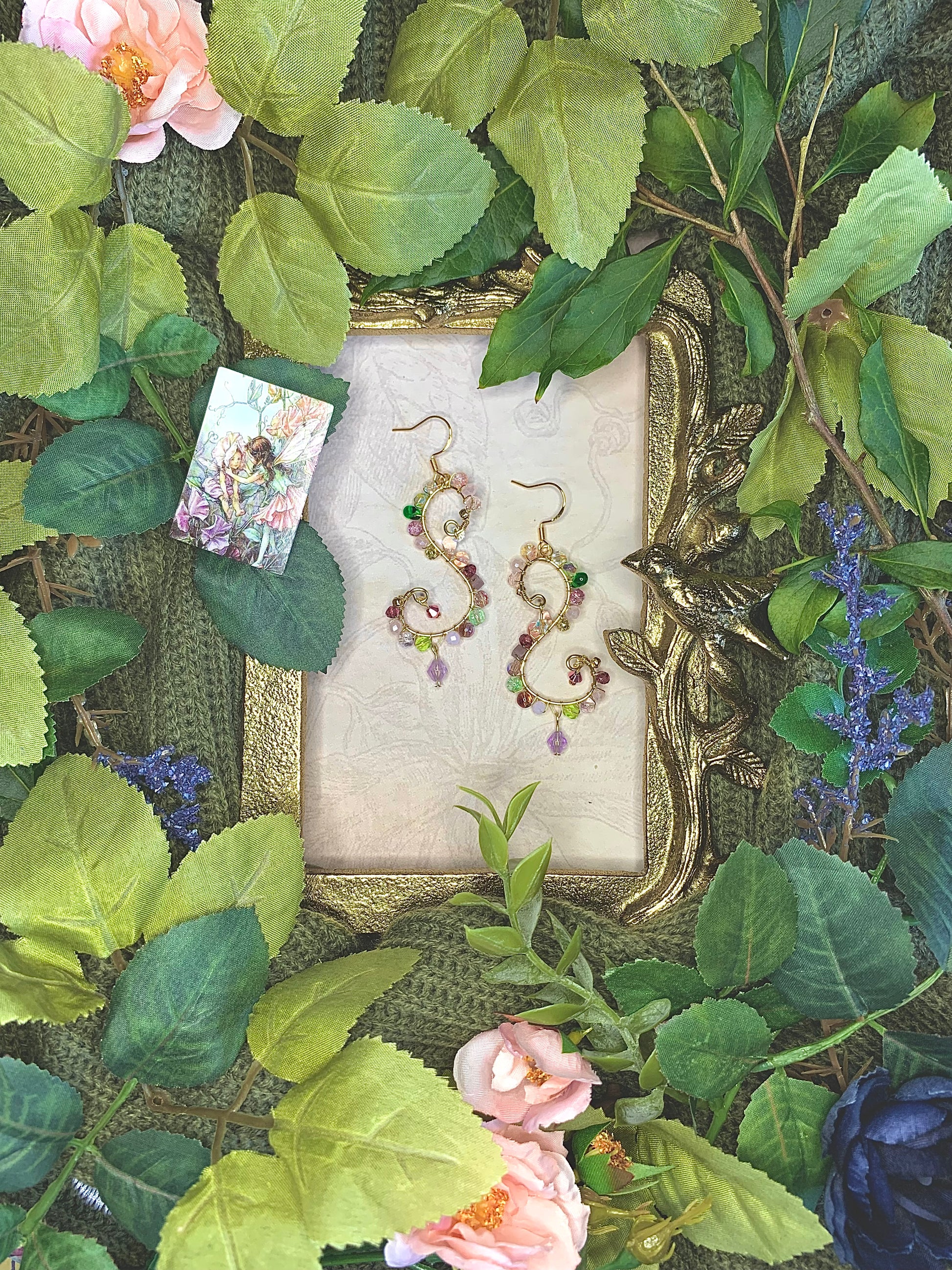 Among a tangle of fragrant blooms, the Sweet-Pea Fairy gently sets a blossom bonnet upon her little sister’s head, their laughter mingling with the summer breeze. These earrings, alive with expressive colors and a touch of playful charm, capture the tender joy and beauty of the sweet pea’s graceful petals.