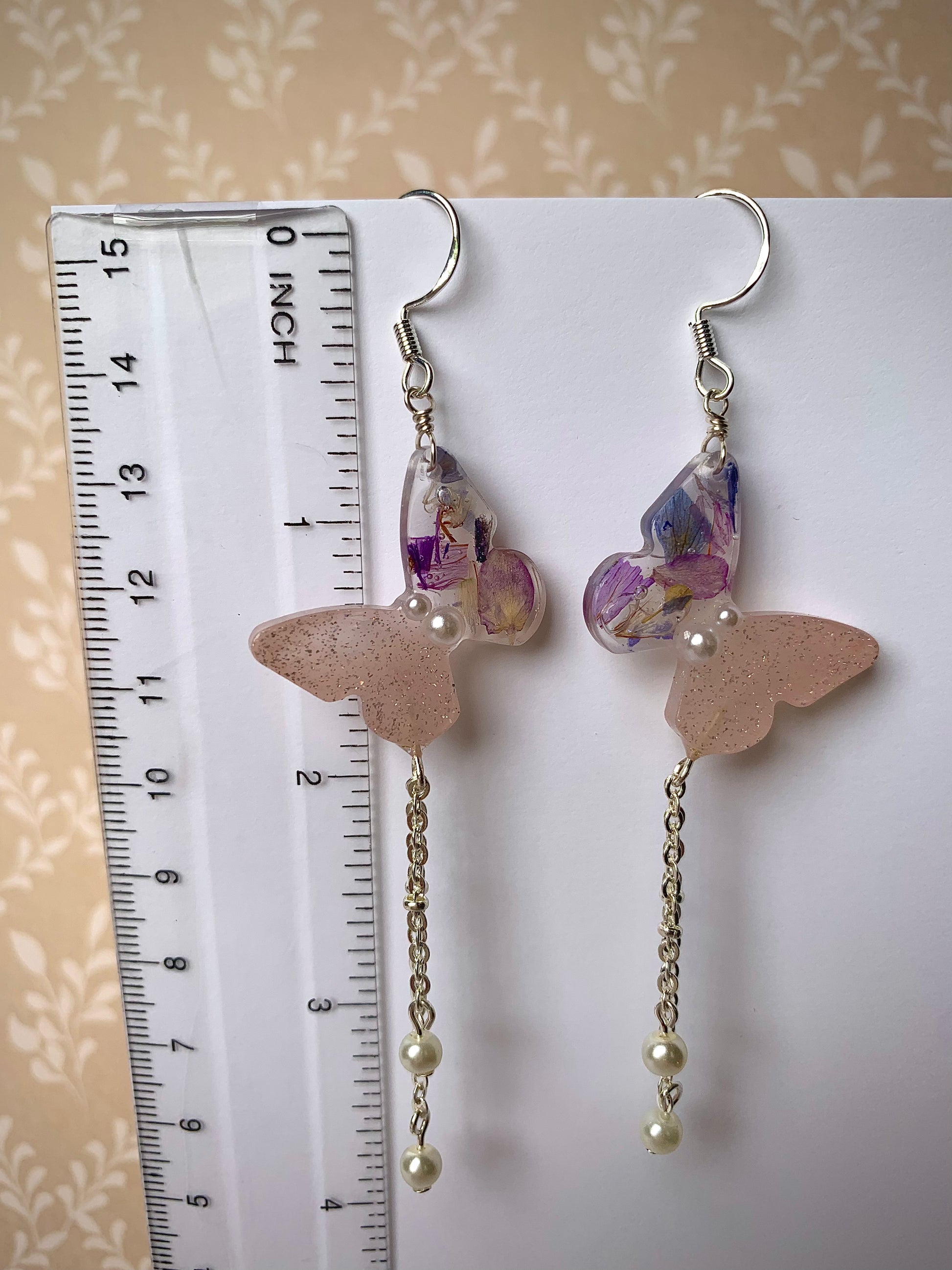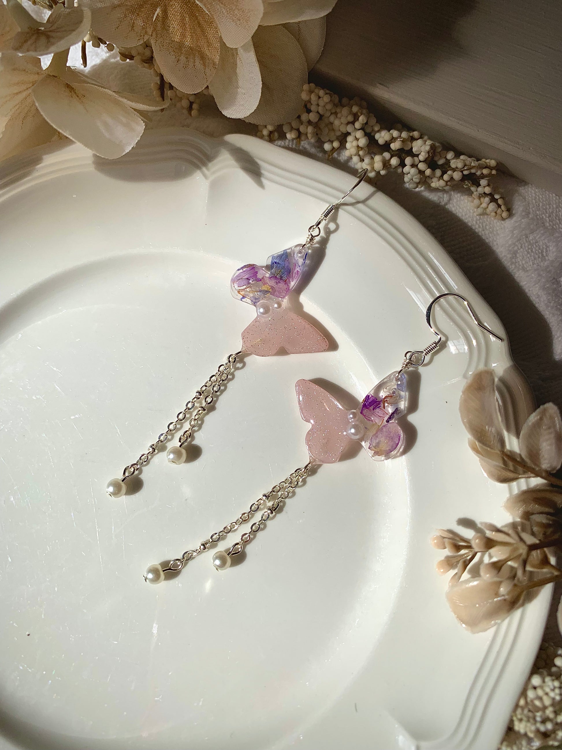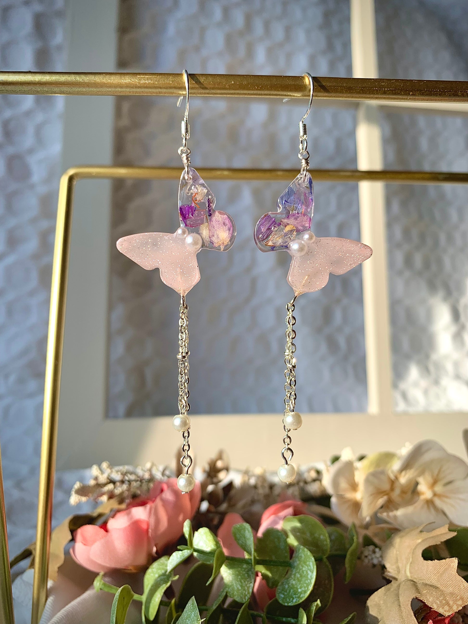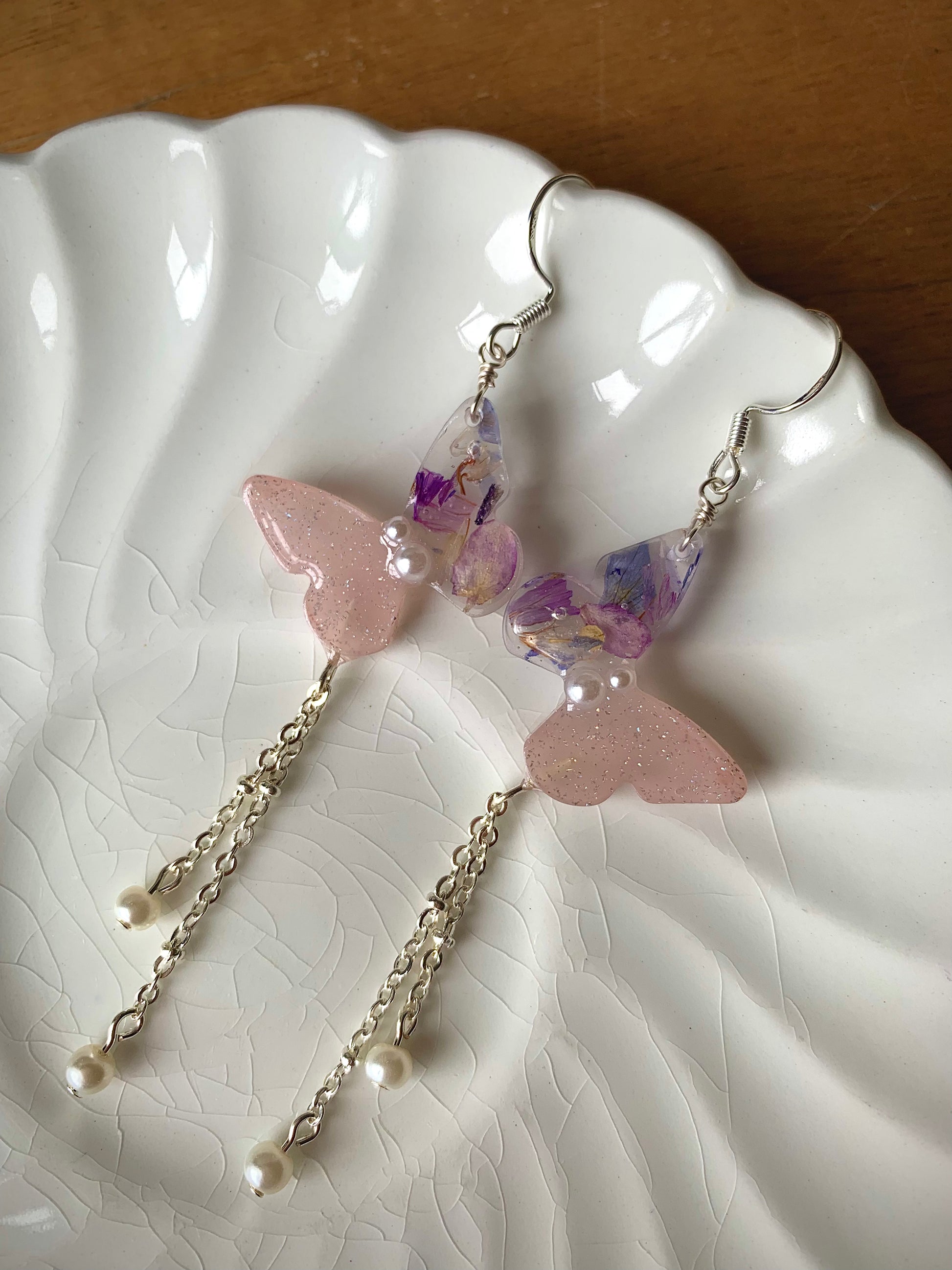 Blossoms take the shape of butterfly wings, each petal preserved in resin like a fleeting dream. Tiny pearls sway from silver chains, light as whispers of magic, as though the butterflies carried morning dew upon their flight.
